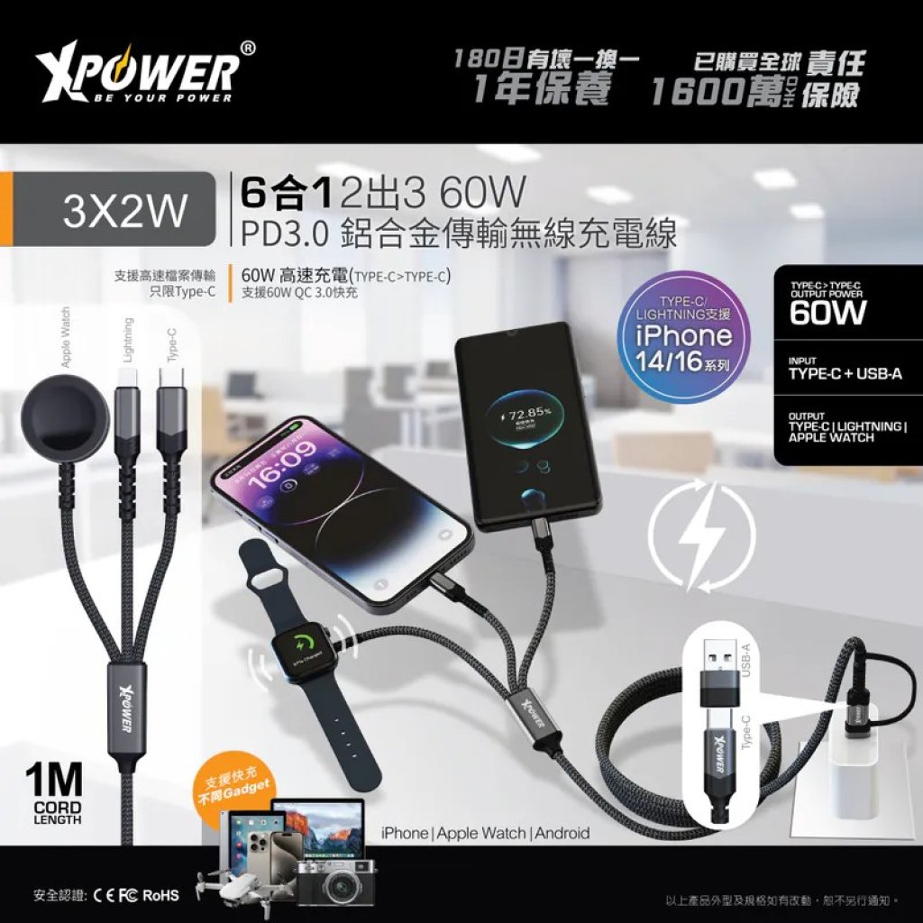 XPower 3X2W 6IN1 2IN 3OUT 60W PD3.0 Aluminium Alloy Sync & Charge Cable (1m)