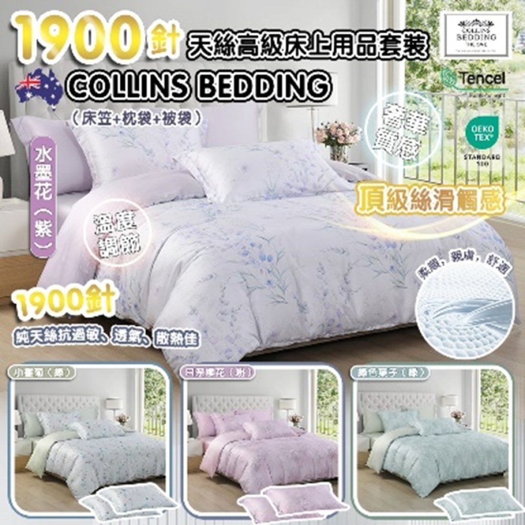 [澳洲CollinsBedding] 1900針超柔天絲四件套 (枕袋+床笠+被袋) 小雛菊(綠) 買2套送1個咕𠱸及紫藤花精油1支 買3套加送1支內衣清潔液